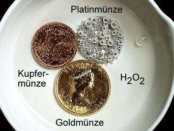 - Wasserstoffperoxid wurde schon durch leichtes Erwärmen zersetzt, weswegen man es auch gekühlt lagert. Deutlich wird der Zerfall aber auch bei Normaltemperatur, wenn man als Katalysator Platin dazu gibt (siehe Bild, wo eine Platin-Münze die Bildung von Bläschen bewirkt). Welche Wirkung hat Platin also hier?